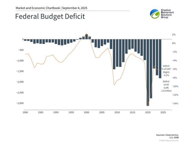The included chart shows the federal budget deficit over time, illustrating how deficits have fluctuated significantly throughout history while markets have generally continued their long-term upward trajectory despite these fiscal challenges.